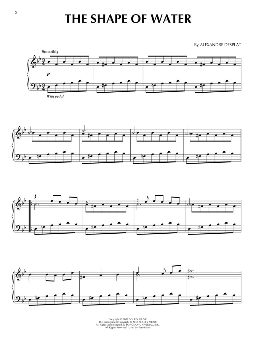 Shape of Water – Piano Solo -nuottikirja sisältää Alexandre Desplatin mestarillisen Oscar-palkitun elokuvamusiikin soolopianolle sovitettuna. Tämä nuottikokoelma tarjoaa kauniita ja tunnelmallisia sävellyksiä, jotka sopivat erityisesti elokuvamusiikin ystäville ja pianistille, joka haluaa sukeltaa elokuvalliseen maailmaan.