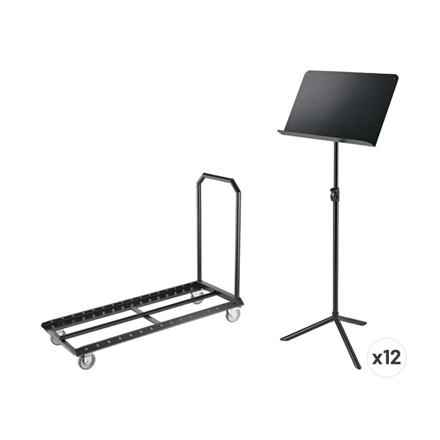 Laadukkaat König & Meyer Overture Orkesterinuottitelineet 12 kpl kuljetus-/ säilytyskärryllä.