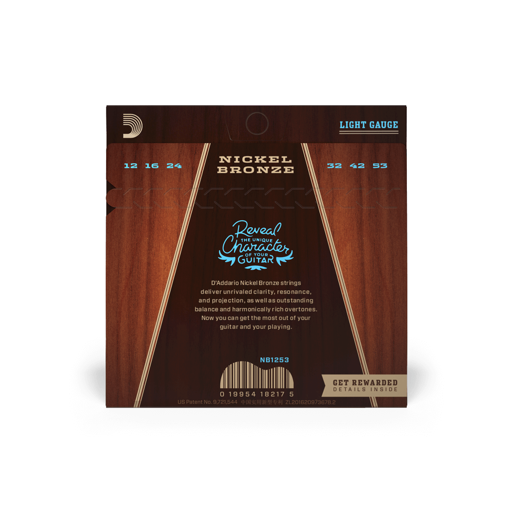 D'Addario Nickel Bronze NB1253 -kielisarja teräskieliselle akustiselle kitaralle tarjoaa kirkkaan soinnin ja erinomaisen kestävyyden. Nikkelipinnoitettu pronssikääre ja NY Steel -ydin tuottavat luonnollisen, dynaamisen äänen. Keskijännitteinen setti (.012-.053) sopii monipuolisille soittajille, niin harrastajille kuin ammattilaisille.