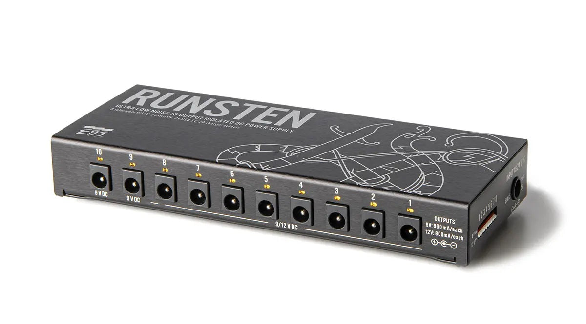 RUNSTEN tarjoaa kymmenen eristettyä 9 V DC -lähtöä, joista kahdeksan on helposti kytkettävissä 12 V DC:iin. Jokainen lähtö tuottaa jopa 900 mA, mikä on lähes kaksi kertaa suurempi kuin useimpien tavanomaisten monilähtövirtalähteiden kapasiteetti. Tämän lisääntyneen tehon ansiosta muusikot voivat käyttää useita pedaaleita, jopa yksiköitä, jotka yleensä vaativat erillisen virtalähteen, yhdellä RUNSTEN-laitteella. Se minimoi virtaan liittyvien meluongelmien riskiä.