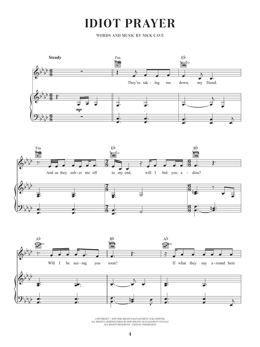 "Idiot Prayer – Nick Cave Alone at Alexandra Palace" on vaikuttava nuottikokoelma, joka sisältää pianolle, lauluäänelle ja kitaralle sovitetut versiot Nick Caven tunnetuista kappaleista. Tämä kokoelma perustuu hänen intiimiin soolokonserttiinsa, jossa hän esitti ikonisia kappaleitaan yksinkertaisen pianon säestyksellä, luoden ainutlaatuisen ja koskettavan tunnelman.