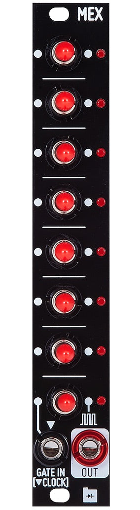 MEX, is a gate expander for Muxlicer! It adds a new line of gates to Muxlicers sequence, where you can choose to turn off the step, output same number of gates as muxlicer, or sending just one. A very simple concept, that provides great flexibilty! And greatest thing: you can daisy chain them so you can add as many as desired!!