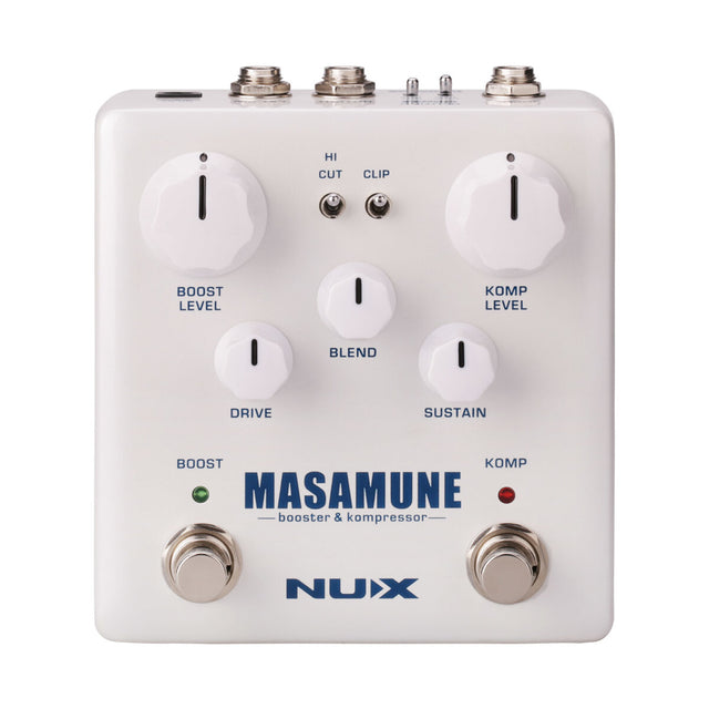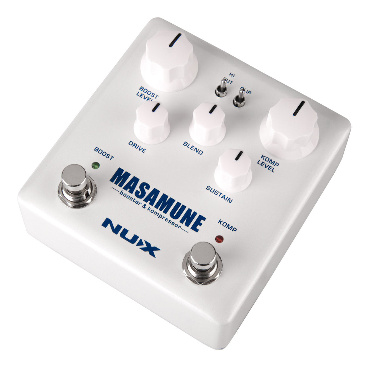 Kitaristin salaiset aseet. Nux NBK-5 Masamune pakkaa yksiin kuoriin keikkailevan kitaristin salaiset aseet: boostin ja kompressorin! Masamune takoo signaaliisi uutta ryhtiä korkealaatuisen kompression avulla, joka on varustettu myös blend-kontrollilla alkuperäisen signaalin dynamiikan mukaantuomiseen. Pedaalin boost-puoli on varustettu miedolla yliohjaamisella sekä reilulla määrällä annosteltavaa boostia. Erillisten Clip- ja Hi-Cut kytkimien avulla voit liiskata signaalia lujemmin ja muokata soinnin ylintä diskanttia puhdistaen ylimääräiset kilinät pois.