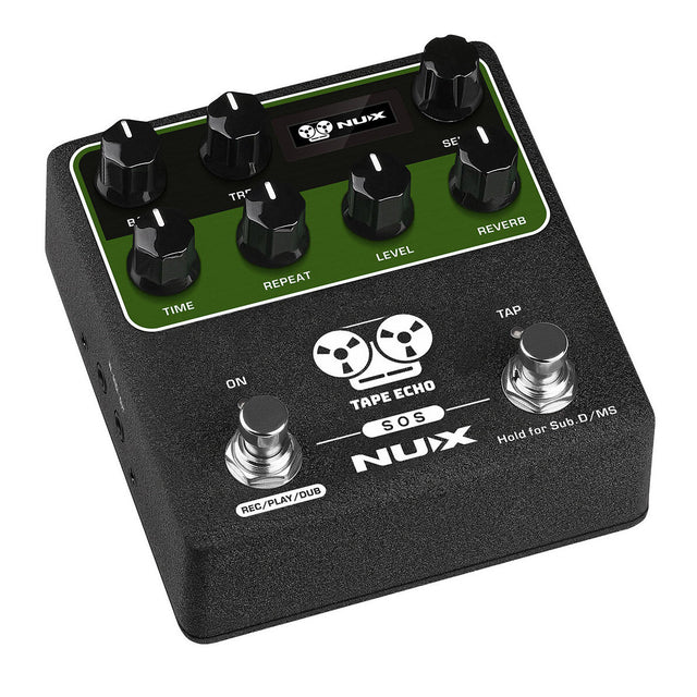 Autenttista nauhakaikua. Nux Tape Echo on tarkka ja uskollinen tribuutti Japanissa valmistetulle Space Echo nauhakaikulaitteelle vuodelta 1974. Analogiset nauhakaikulaitteet äänittävät sisääntulevan signaalin magneettinauhalle, jolta tämä toistetaan nauhan pyörimisnopeuden ja valitun toistopään määrittämällä viiveellä. Nux Tape Echo tuo tämän magneettinauhalle äänittämisen ja toistamisen aiheuttaman saturaation, kompression ja muut kiehtovat vajavuudet vakuuttavasti digitaaliseen pedaalimuotoon. NDD-7 käyttää Nuxin Core-Image teknologiaa toisintamaan magneetinauhan ja koko äänityskoneiston monimutkaiset interaktiot erittäin vakuuttavalla tasolla. Kahden jalkakytkimen avulla pedaali mahdollistaa helpon pääsyn Tap Tempoon, sisäänrakennettuun 40s Sound-On-Sound loopperiin sekä jopa nauhadelayn itseisoskillointiin!