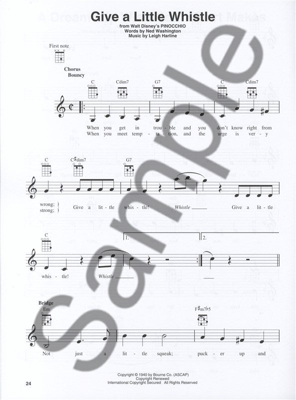 Disney Songs for Ukulele on upea nuottikirja, joka sisältää 20 rakastettua Disney-kappaletta sovitettuna erityisesti ukulelen soittoon. Tämä kokoelma on täydellinen niin aloittelijoille kuin kokeneemmillekin soittajille, sillä sovitukset sisältävät melodiat, sointumerkit ja sanat, joten niitä voi soittaa sekä soolona että laulun säestyksenä.