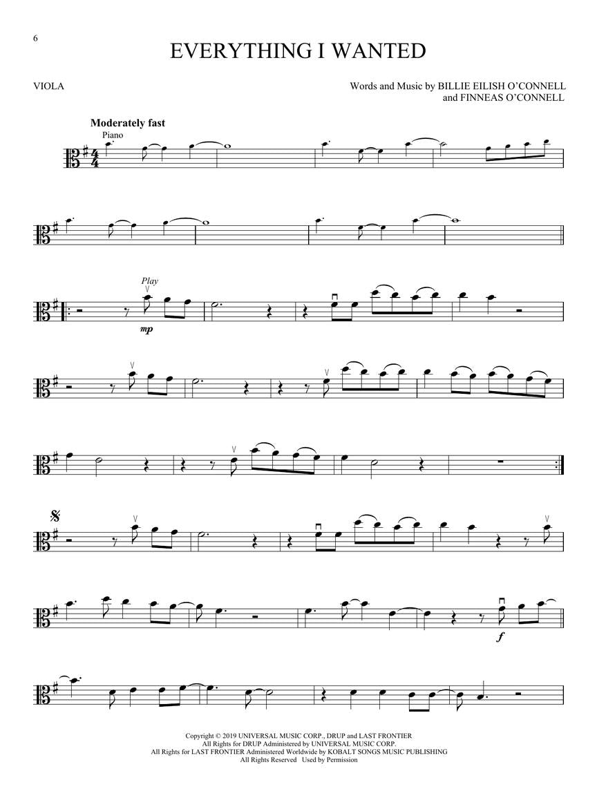 "Billie Eilish – Viola" on alttoviululle sovitettu nuottikirja, joka sisältää äänitiedoston verkossa. Teos tarjoaa 15 Billie Eilishin tunnetuinta kappaletta, kuten "Bad Guy", "Lovely" ja "When the Party's Over". Sovitus on soolosoittajalle sopiva ja sisältää melodiat selkeässä muodossa.