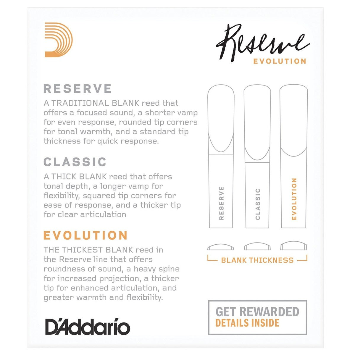 D'Addario Reserve Evolution 3.0 -klarinetin lehti on luonnonruokolehti, joka tarjoaa lämpimän äänen, herkän artikulaation ja erinomaisen kontrollin. Se sopii edistyneille ja ammattiklarinetisteille orkesteri-, studio- ja konserttikäyttöön.