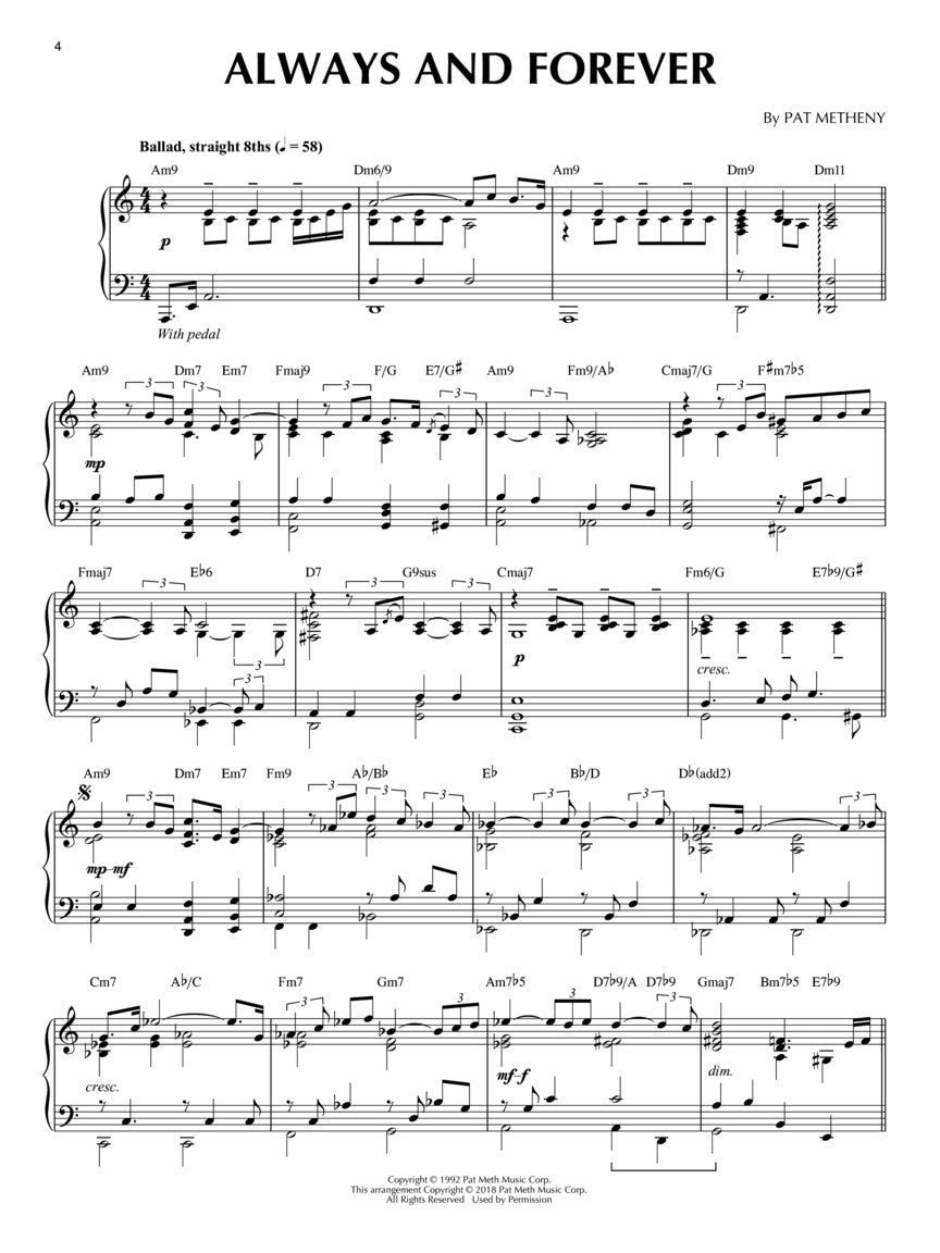 Pat Metheny – Jazz Piano Solos Vol. 57 on ainutlaatuinen nuottikokoelma, joka esittelee jazz-kitaristi ja säveltäjä Pat Methenyn ikonisimpia sävellyksiä pianistiystävällisissä sooloarregloissa. Kirja kuuluu suositun Jazz Piano Solos -sarjan osaan 57 ja tarjoaa haastavia sekä musikaalisesti rikastuttavia sovituksia sekä harrastajille että ammattilaisille. Tyyli pohjautuu jazzin, fuusion ja modernin improvisoidun musiikin elementteihin, ja kokoelman kappaleet soveltuvat hienosti sekä opiskeluun että esityksiin.